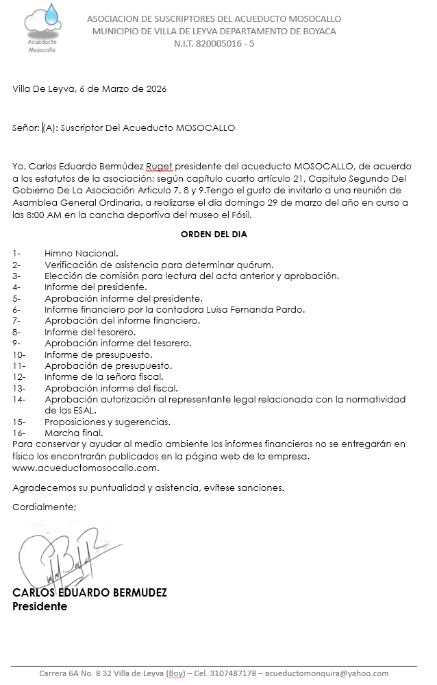 Yo, Carlos Eduardo Bermúdez Ruget presidente del acueducto Mosocallo, de acuerdo a los estatutos de la asociación; según capítulo cuarto artículo 21, Capitulo Segundo Del Gobierno De La Asociación Articulo 7, 8 y 9.Tengo el gusto de invitarlo a una reunión de Asamblea General Ordinaria, a realizarse el día domingo 29 de marzo del año en curso a las 8:00 AM en la cancha deportiva del museo el Fósil.